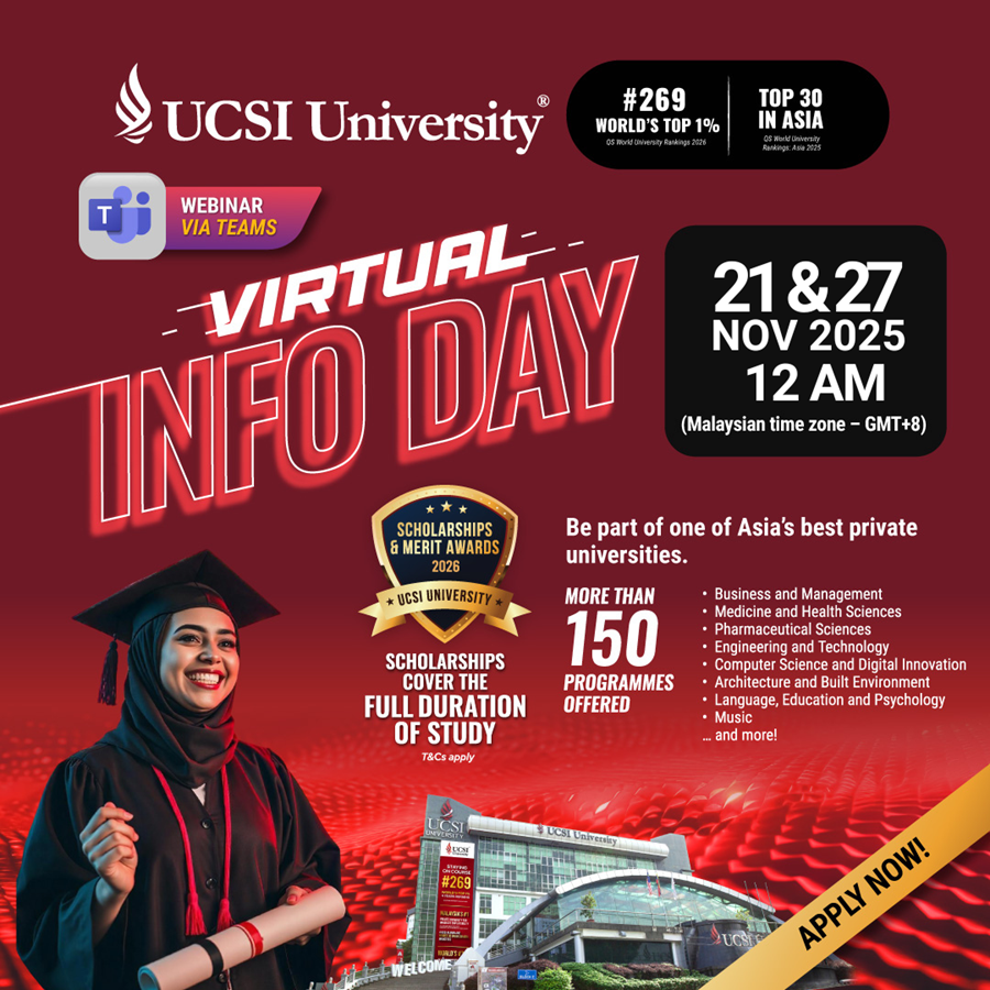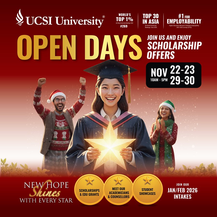 Established in 1986, UCSI University has steadily risen as a premier institution with 4 campuses and a vibrant student community from over 120 nations. Offering 150+ programmes from Pre-U to PhD, UCSI is home to top 2% global scientists and boasts 100% graduate employability. Pioneering Southeast Asia’s first mandatory internship in 2004, UCSI blends academic excellence with real-world experience, ranking in 9 QS subjects including Music and Hospitality.