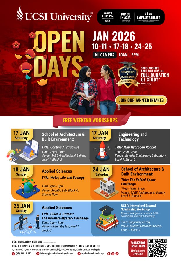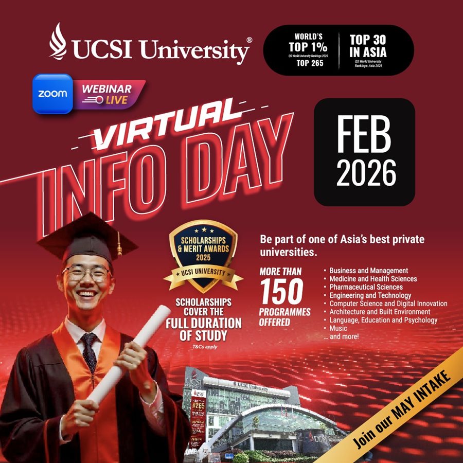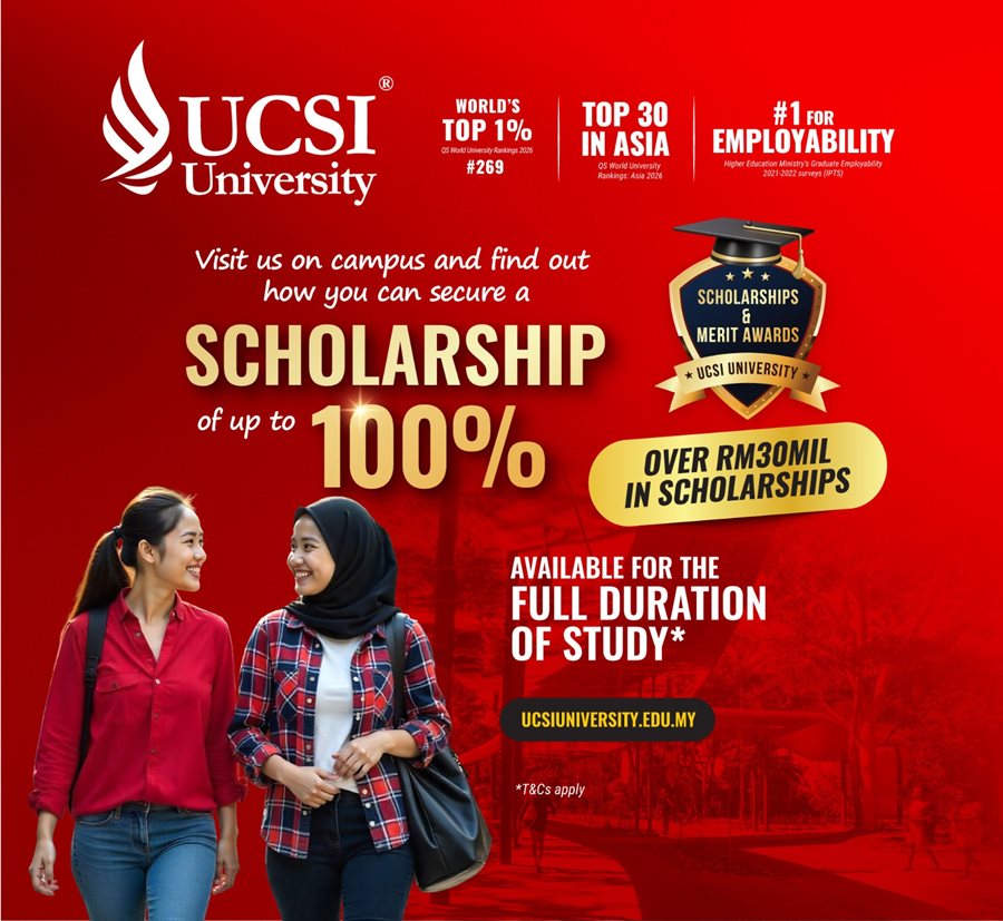 Established in 1986, UCSI University has steadily risen as a premier institution with 4 campuses and a vibrant student community from over 120 nations. Offering 150+ programmes from Pre-U to PhD, UCSI is home to top 2% global scientists and boasts 100% graduate employability. Pioneering Southeast Asia’s first mandatory internship in 2004, UCSI blends academic excellence with real-world experience, ranking in 9 QS subjects including Music and Hospitality.